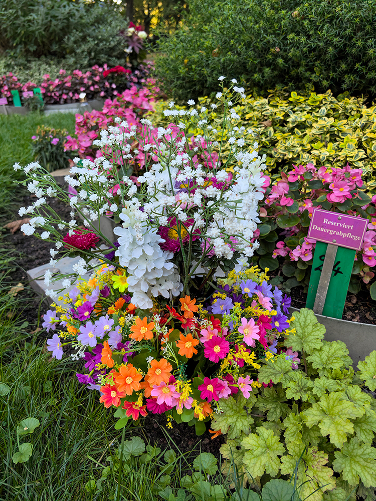 Es wurde viel zeitlicher und finanzieller Aufwand investiert, um eine gärtnerisch interessante und auch vielfältig bunt-blühende lebendige Grab-Anlage auszubauen.