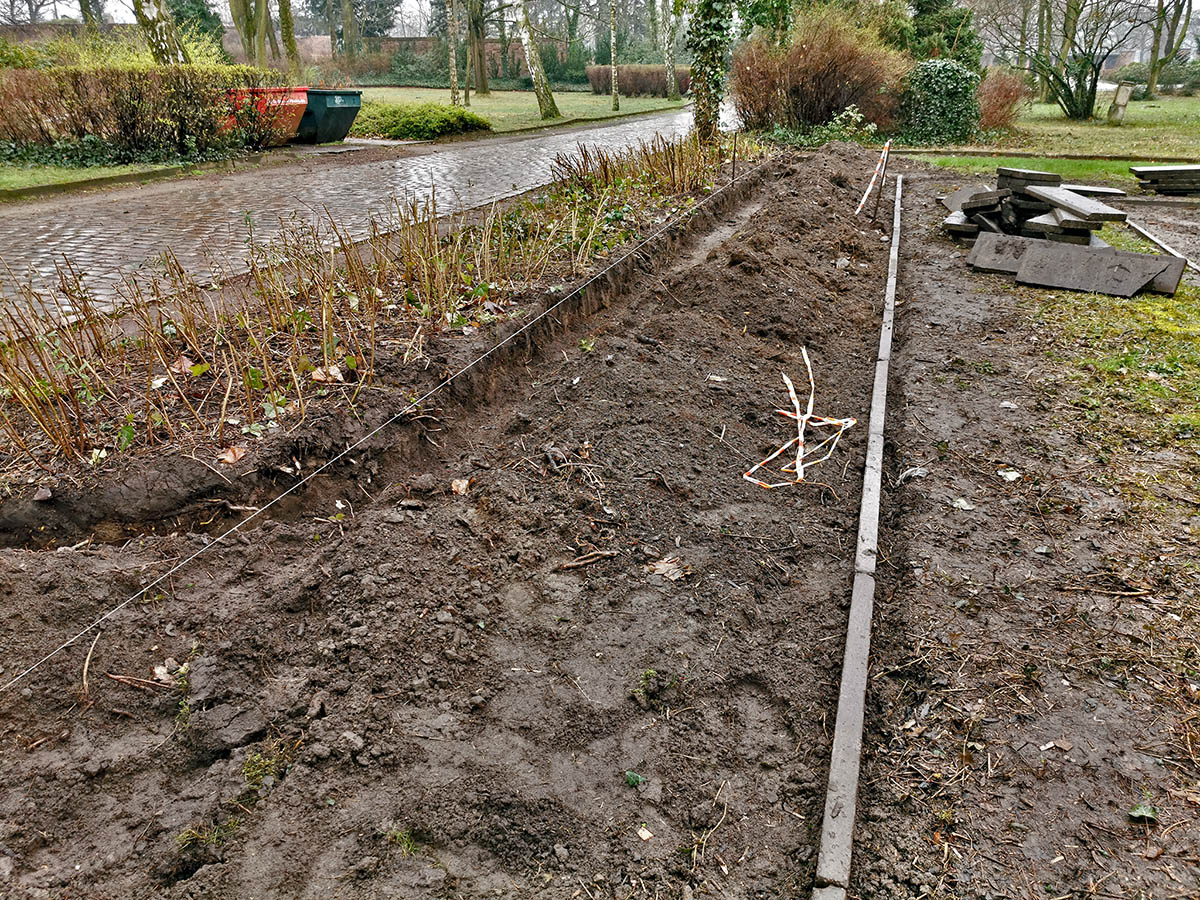Mit großem Enthusiasmus begannen wir - noch vor Corona - am 25.6.2019 mit den Arbeiten, die besonders anspruchsvoll waren, da sich an der Stelle bereits eine ältere Anlage mit damals noch 11 Gräbern befand. Diese Gräber sollten in die neue Anlage integriert und die notwendigen Arbeiten möglichst rücksichtsvoll durchgeführt werden.