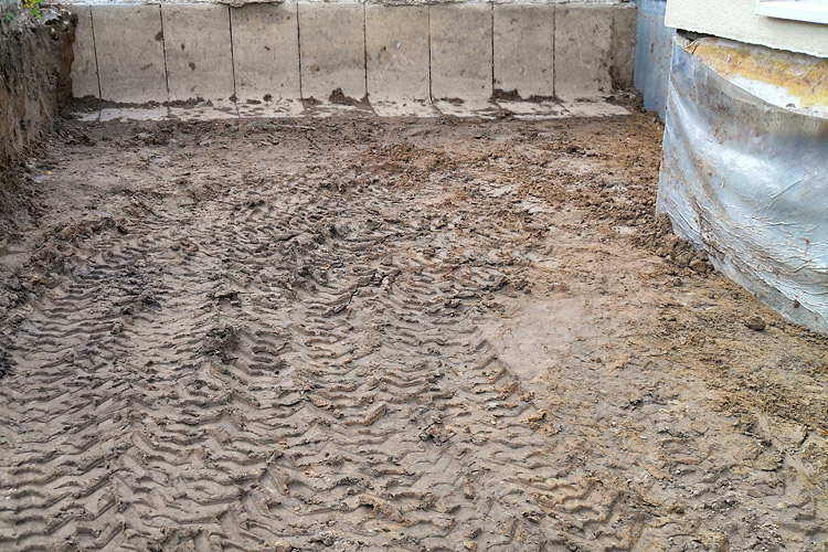 Der feuchte und lehmige Unterbau der alten Terrasse muss bis zum Fundament des Hauses aufgenommen werden