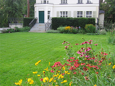 - Pflanzung von Gehölzen: 2m hohe Eibenkarrees vor der Terrasse, 1,50m hohe Buchenhecken, viele Ziersträucher und Buchsbaumhecken