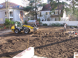 Nach dem Abschluss größerer Bauarbeiten auf dem Grundstück wird der Boden im Herbst mit einem Radlader planiert