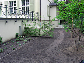 Nach dem Neubau unterirdischer Gebäudeteile sollte der Garten neu angelegt und eine neu gebaute Terrasse gestaltet werden.
