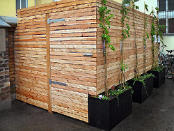 Die Holzverkleidung verbirgt die Müllbehälter; die Pflanzkübel bieten dem Blauregen gute Wachstumsbedingungen
