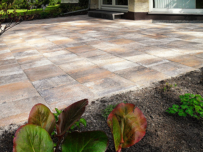 Hier wurde von den Hausbesitzern eine mediterrane Optik gewünscht, daher haben wir uns für die Beton-Pflastersteine "Riva Nova® Soft" von Berding Beton entschieden. Diese Pflastersteine gibt es in verschiedenen Größen und Farbgebungen, so dass sich unterschiedlichste Verlegemuster realisieren lassen.