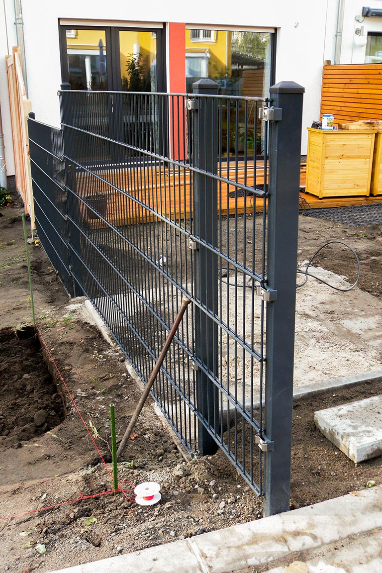 Als Grundstücksbegrenzung bauen wir einen Zaun aus Doppelstabgittermatten. Ein solcher Zaun wirkt nicht zu massiv und kann auf Wunsch später begrünt werden.