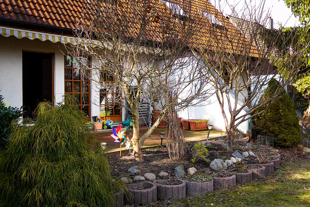 Beim Blick vom Garten zeigt sich die Absenkung der Terrasse im rechten Bereich deutlich. Die Beeteinfassung zum Rasen aus Pflanzringen sollte ebenfalls ersetzt werden, außerdem beschatteten die beiden im Laufe der Jahre zu groß gewordenen Sträucher die Terrasse zu sehr und trugen erheblich zur Moosbildung auf dem Plattenbelag bei.