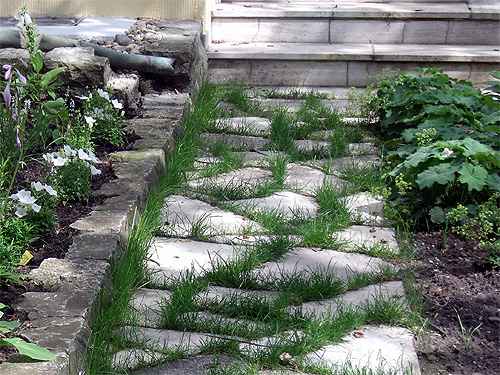 Trittflächen im Rasen, aus Betonsteinen gepflastert